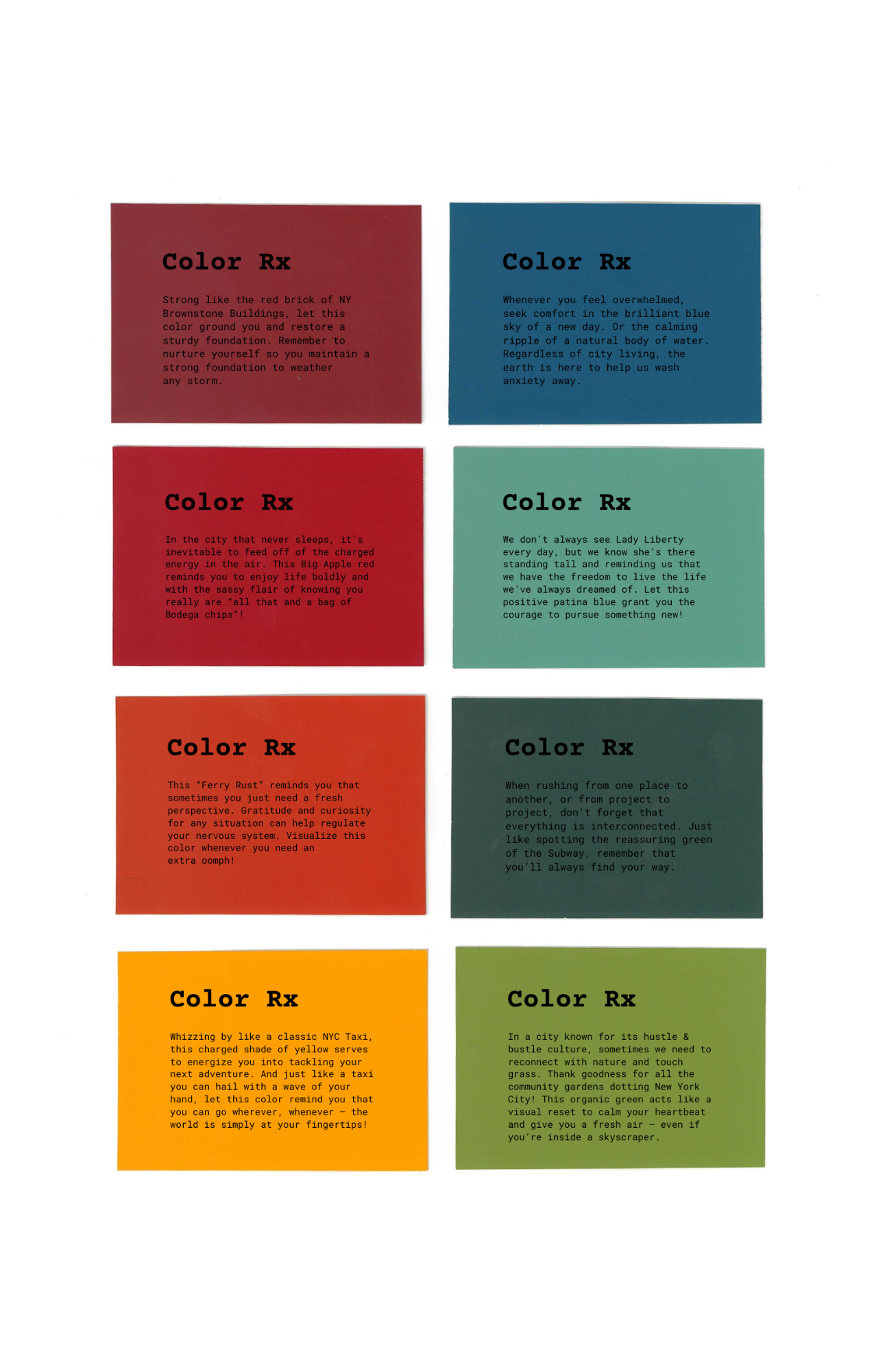 A print of eight, hand-selected Color Rx chips in a New York City specific palette to provide a weekly dose of mood boosts based on the Big Apple.